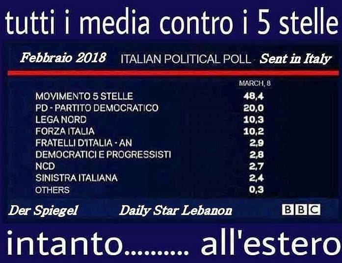 A fake poll attributed to Der Spiegel, the Daily Star Lebanon and the BBC claimed M5S were polling at 48% while other polls reported 28%. The image contains incorrect names for some of the parties and was refuted by journalist Enrico Mentana as “annoying and counterproductive”.