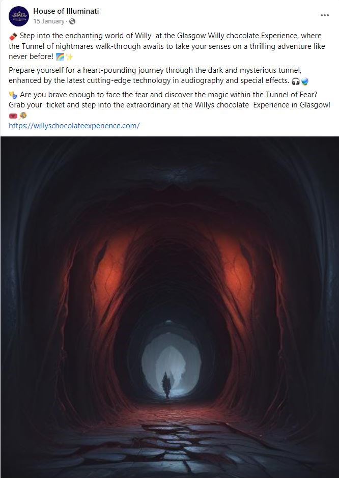 These images that portray creative, imaginative scenes are reminiscent of key scenes in the 1971 film Willy Wonka & the Chocolate Factory, such as the famous tunnel scene, chocolate room, and inventing room. House of Illuminati also posted to various Facebook pages to advertise the event. These include ‘Things to do in Scotland with our children’, ‘What’s On In Scotland’, ‘Things To Do Glasgow’, and ‘What’s on around Glasgow’.
