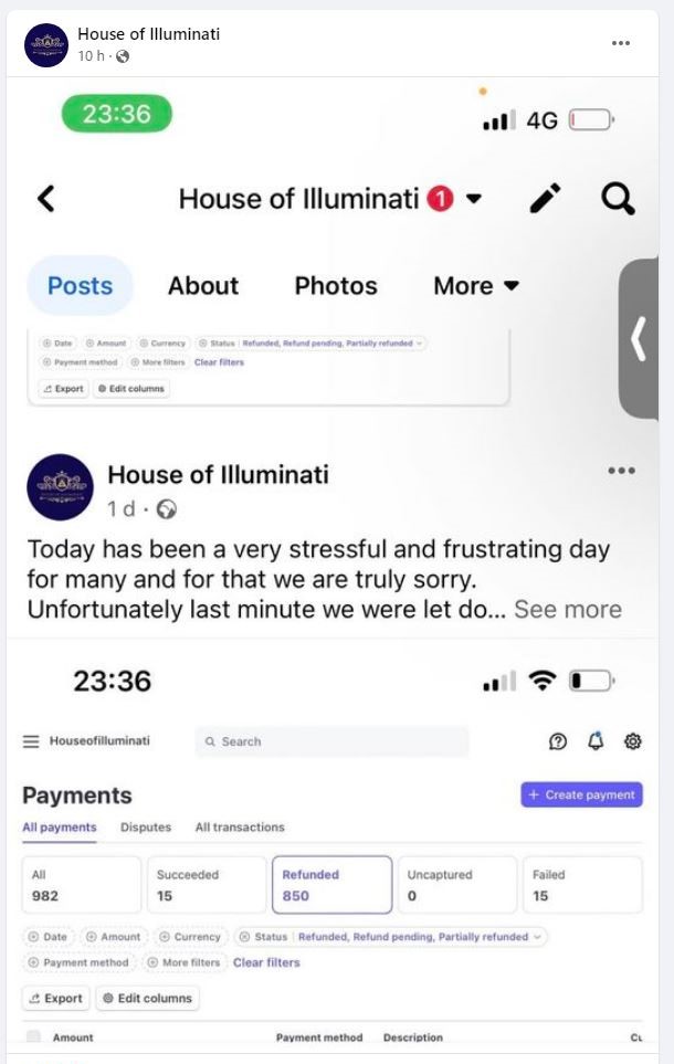 The reality, however, is still serious and this incident has caused real-world financial harm. The rate for tickets was between £18-35 and according to a screenshot shared by House of Illuminati [below], 982 payments were made for the event. This means almost £20,000 was taken from attendees.