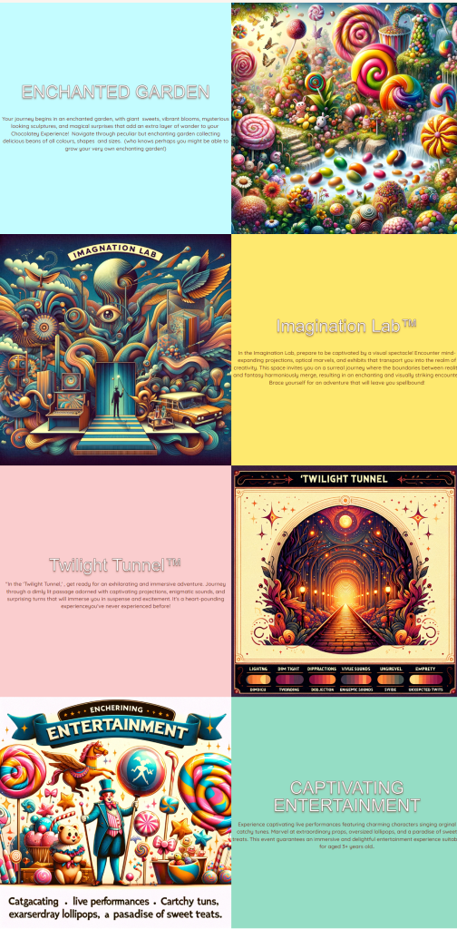 The event website features four AI generated images: Enchanted Garden, Imagination Lab, Twilight Tunnel, and Captivating Entertainment. One key giveaway to these image’s AI provenance is the text. The images nonsensically refer to: