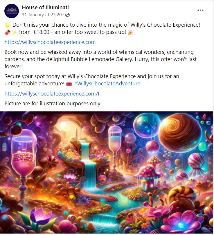 The House of Illuminati Willy’s Chocolate Experience incident offers a good case study of the (mis)use of generative AI images in a UK context. It demonstrates the real-world harms that can be caused by online content and how emergent, developing technologies can wreak havoc when they are not used in a transparent, ethical manner.